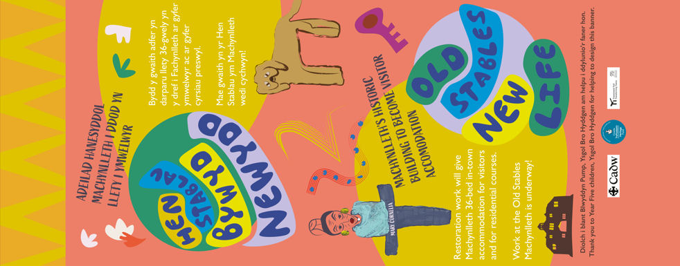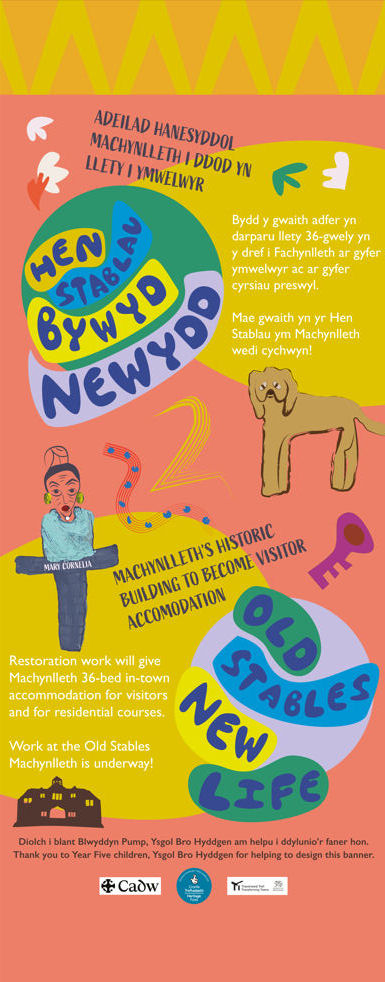 Striking banners designed by Liz Fenwick are based on ideas from pupils of Year Five Ysgol Gynradd Bro Hyddgen.