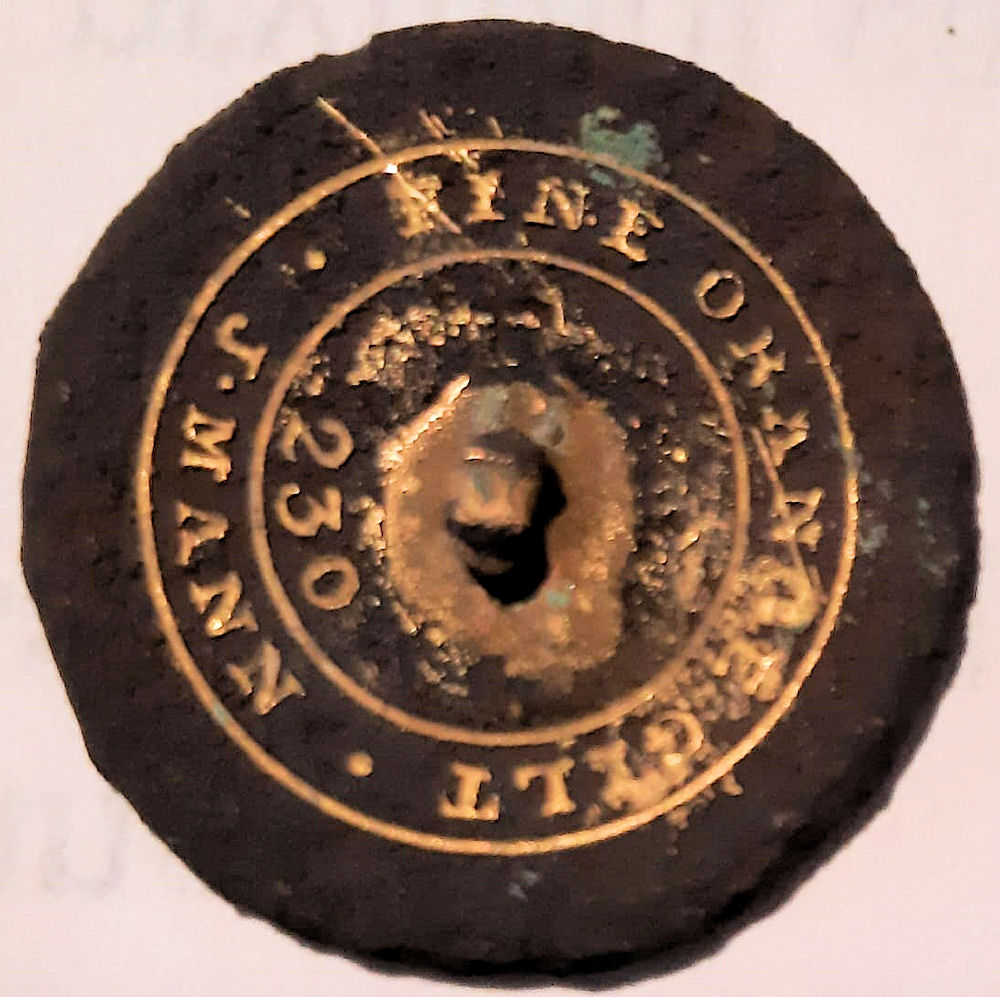 This button made by J. Mann of Birmingham (1805-1843), may have been sewn onto the livery jacket of a groom or huntsman. Similar J. Mann buttons have been found at American Civil War sites.